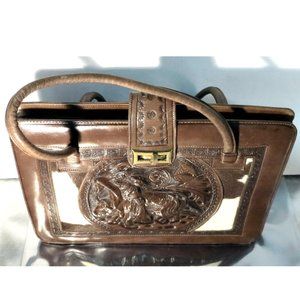 Vintage Hand Tooled Brown Leather / Calf Skin Purse Handbag, Mexico