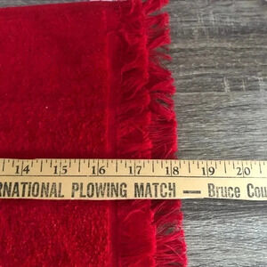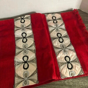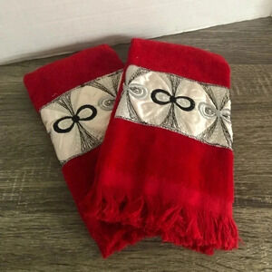 Very soft red 100% cotton towels with beige accent stripe. Embroidered design in black and silver/greys. Made in USA by Cannon.