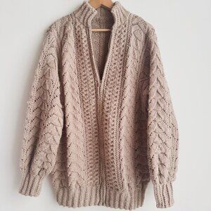 Vintage Hand made Beige Brown Chunky Knit Cardigan Zip Up M