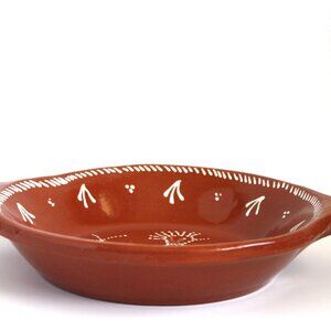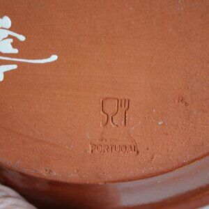 In very good condition. Hand painted. Made in Portugal. Signed and stamped on bottom. Nice quality piece. Measures 9 inches in diameter. Great looking pie plate with handles on sides. Cute bird running across plate, maybe a roadrunner. No chips or cracks.