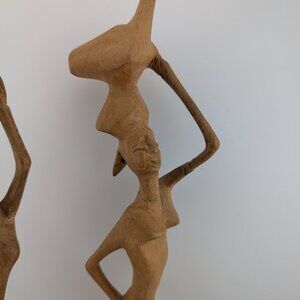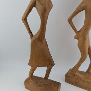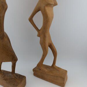These are older, handmade pieces showing visible signs of age and fragility. Both sculptures have fine cracks near the waist and neck areas, typical of vintage wood under natural drying and stress. They remain stable and display beautifully, but are best suited for gentle handling or shelf display.