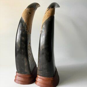 Vintage Hand-Carved Water Buffalo Horn Pair Dragon & Tiger Asian Art Decor
