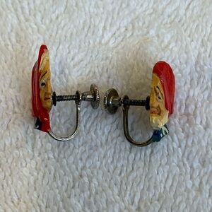 Charming and unique, these vintage hand-carved screw-back earrings feature painted wooden profiles of an elderly couple in red babushka scarves, reminiscent of Eastern European folk art. Lightweight and highly detailed, these earrings are a delightful conversation piece. Each earring measures just over 1 inch tall. A must-have for collectors or anyone who appreciates whimsical, handcrafted jewelry!