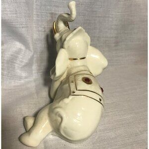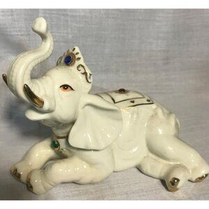This charming vintage ceramic elephant figurine captivates with its hand-painted details and vibrant gemstone accents. A delightful addition to any collection.