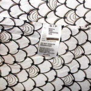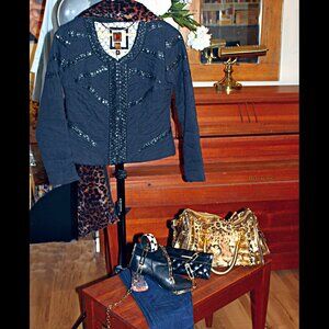 This is seen in this charcoal black thin quilted jacket which can be paired with jeans to skirts and dress. Finished off in tiger stripe black stitching the satin finish black sequins in round and square are set off by black satin finish glass bugle beads outlining the v neck collar and striping the body and arms. Cut for a slim fit this jacket skims curves without restricting. Depending on how you feel the versatility of this jacket lends itself to being worn open or close with the hidden hook and eye closures. A contrasting in printed white cotton muslin lining hides beneath the soft black shell. This trendy casual number transition from day to nightwear without a problem.