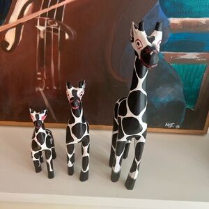 Set of three handcrafted giraffe figurines in black and white. Perfect for home decor. 11.5", 6" and 8" tall