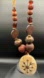 The necklace strand alternates black and brown horn, metal, wood and glass beads and is accented with a carved brown and white beads at each side of the strand.