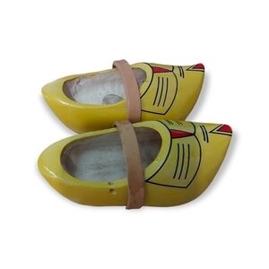 These beautifully hand craved and hand painted children's wooden clogs are in pristine condition. Used only as a display but can be worn. Real leather strap. Free from cuts, scratches, chips, and crazing. Shoes measure 3 inches interior, 4 inches exterior, 1.5 inches wide, 1.50 inches tall.