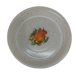 Vintage handmade and signed artisan pottery bowl. Speckled off white glaze with fruit design.