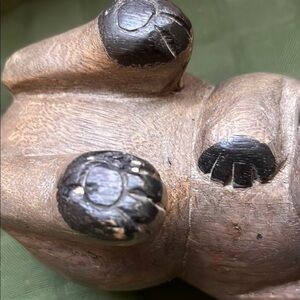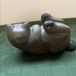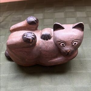 Charming wooden cat figurine in a playful pose. Features a mix of brown and black colors. a vintage, hand-carved wooden cat figurine.