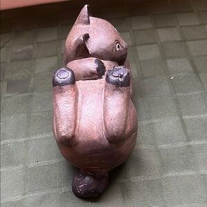 Charming wooden cat figurine in a playful pose. Features a mix of brown and black colors. a vintage, hand-carved wooden cat figurine.