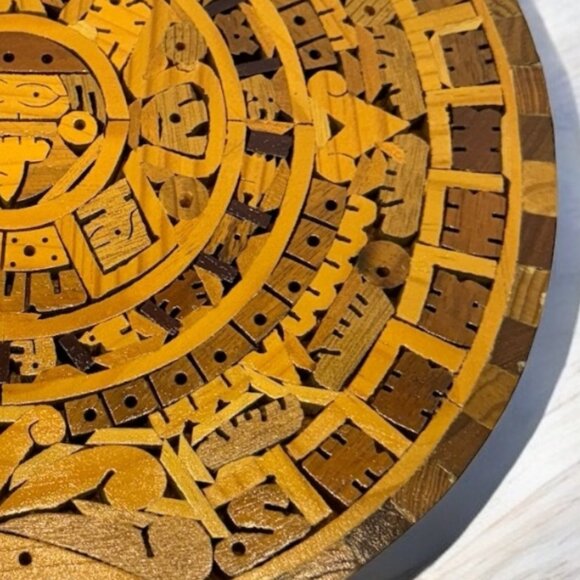 Vintage Handcrafted Wooden Mexican Aztec Calendar Inlay Mosaic Wall Decor