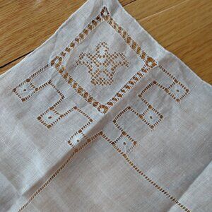 Gorgeous vintage handmade hankie with hand embroidered openwork featuring motifs of crowns or fleur de lys.