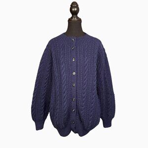 Vintage handknit cardigan featuring a thick braided cable knit pattern in a rich navy blue. This soft, breathable sweater is made with a chunky yarn that offers warmth without bulk, ideal for layering through fall and winter. Designed with full button front, ribbed cuffs and hem, and two roomy pockets.