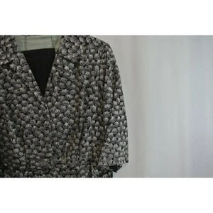 Vintage dress with an Oriental style, likely handmade. Shell print fabric on top and floral print on black (likely silk) on the bottom. Also has a wide sash in the same fabric as the floral print. Small belt to cinch it tighter at the waist. Collared V neck and half sleeve. Looser fit with a slight flare towards the bottom hem. I don't know how the sash is meant to be worn, perhaps bound at the waist in a kimono style?