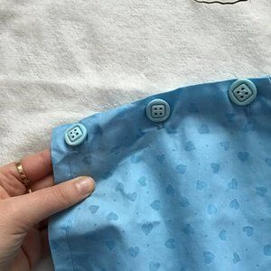 It is a light blue with a gorgeous delicate heart pattern, buttons on the shoulders, and a 2 line v-neck front and 3 line v-neck back.