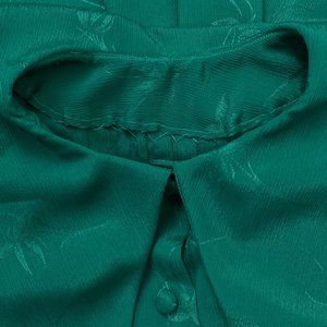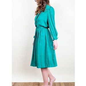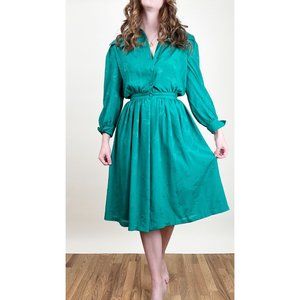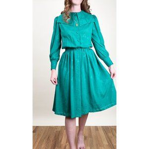 This stunning vintage midi dress features a button-down bodice, pleating at the waist, long balloon sleeves, oversized collar, puffed shoulders, and covered buttons. Absolutely perfect piece for year-round wear! This beautiful dress can be worn to weddings, picnics in the park, baby showers, holiday parties, date nights, drinks with friends, or on a romantic getaway vacation. Guaranteed to get you so many compliments when you wear this piece! A gorgeous emerald forest green color. Excellent pre-owned vintage condition. No flaws and minor wear.