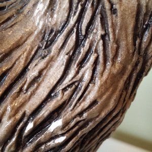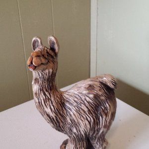 This Beasties of the Kingdom full-size figurine, 1990 Lana Llama, by former Universal and Disney artist/sculptor John Raya. Handmade (per website) and imprinted with the artist's signature. It has a "like new" appearance in general, but does have some very minor scuffing, and light paint chipping, which do not distract from the overall cuteness and value of her. The display side (left side where the llama is facing) appears flawless. You really have to search closely to find any flaws. The larger flaws are both on the right side, which makes them unnoticeable unless you are looking for them. The tip of one toe on the facing side has a very small surface scrape, which goes through the glaze and color, but no further. It is not a chip. The most noticeable flaw are side by side narrow, 1/4 inch long chips on the right shoulder. Both of these can be seen if you look carefully at the photo of the right side. This little collectible stands 8 1/2 inches tall. It is a solid item. Possibly made of heavier resin, glazed finish.