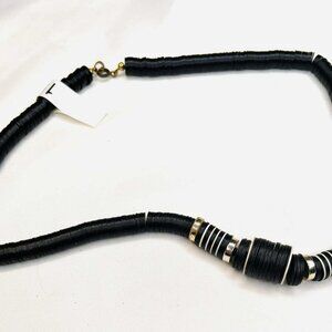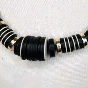 A minimalist yet striking vintage necklace crafted from stacked black plastic discs with bold metal accent rings. The clean geometric rhythm and handcrafted construction give it a distinctly modernist 1980s character — simple, graphic, and effortlessly wearable.