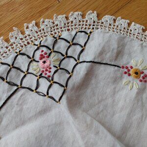 Very pretty handmade vintage doily with embroidered flowers and crocheted trim.