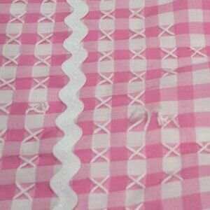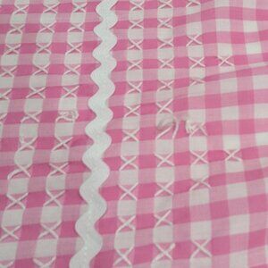 This is a typical mid-century style kitchen apron, made of pink and white gingham fabric and embroidered/cross stitched in white. There are three places where the white stitching has come loose (which I hope show up on the photos) - these could easily be repaired. It is also trimmed with white rick rack.