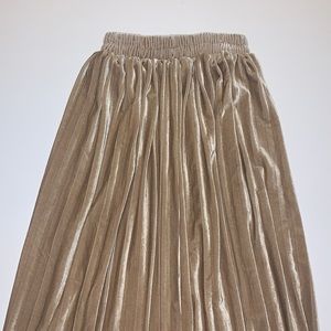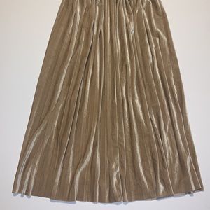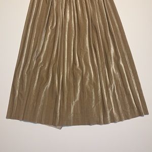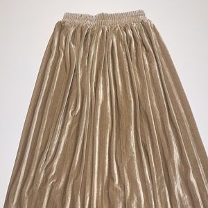 EUC vintage gold pleated velvet A-line skirt with stretchy ruched elastic waist in women’s size small (S).
