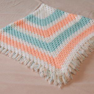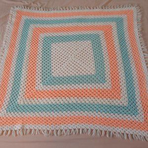 Vintage Handmade Handknit Peach, Blue & White Afghan Baby Blanket 38" x 38"