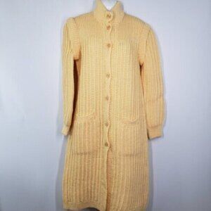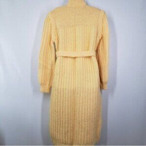 Yellow gold hand knit maxi length cardigan. Button up close with a self tie belt and POCKETS