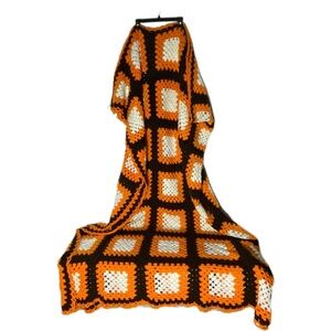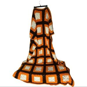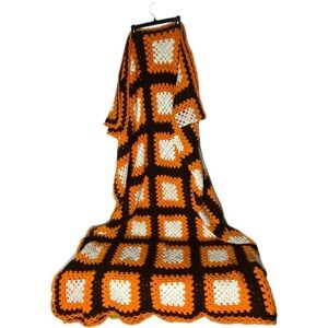 Vintage Handmade Orange Brown White Large Granny Square Crochet Blanket Afghan
