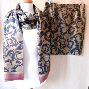 This is a truly unique vintage find: a handmade black and gold print knee length pencil skirt and matching reversible long scarf. The set has a striking pattern in a bold colour palette. As a handmade item, it is a one-of-a-kind piece with a high level of craftsmanship. The skirt has an open 4” pleat at center back hem for a beautiful silhouette, and the matching scarf with a coordinating border of burgundy adds a touch of retro flair.