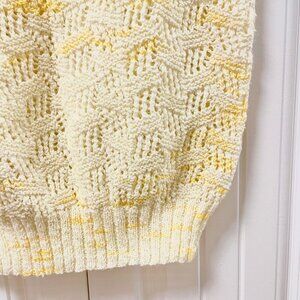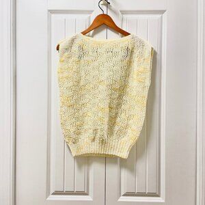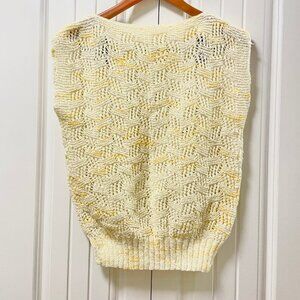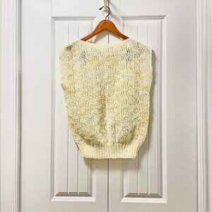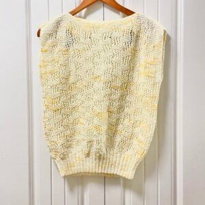 Adorable vintage sleeveless popcorn knit sweater vest in a cream and butter yellow marled pattern. Features a flattering boatneck neckline and soft stretchy ribbed hem. The airy knit texture makes this a perfect transitional piece for spring or layering over long sleeves in cooler weather. So charming and unique!