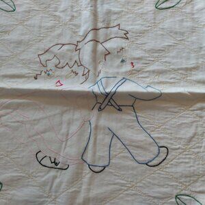 Vintage Quilt featuring embroidered designs of a country prairie boy and girl dancing, simple flowers and sweet chubby birds.