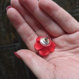 Vintage Handmade Red Rose Stud Earrings Unique Cottage Romantic Elegant Lovely, vintage red rose earrings! These earrings appear to be handmade as you can see that the petals were molded by hand. These are a vibrant red colour and are approximately 1" in diameter. They are in excellent condition!