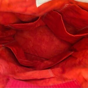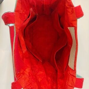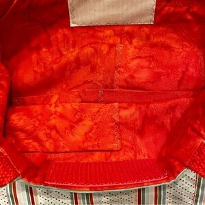 Vintage corduroy bag with buttons. Likely handmade. Sage green on outside. Poppy red on inside with funky splatter fabric pattern. Blue, green, pink, and white patches with stripes and polka dots. Two exterior pockets on each side. 5 inside pockets. Three vertical green exterior buttons on one side. Four vertical red exterior buttons on the other side. Some minor signs of wear, but great pre-loved condition. An adorable, versatile addition to your wardrobe for all seasons!