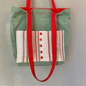 Vintage Handmade Sage Green & Poppy Red Corduroy Bag with Buttons