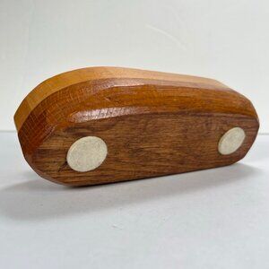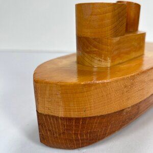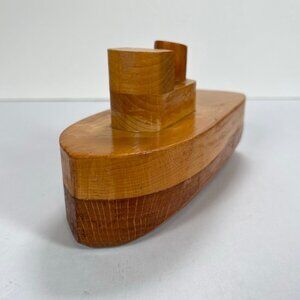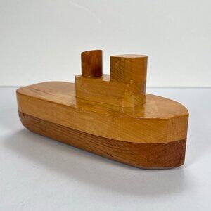 This handmade solid wood boat toy is perfect for children of all ages. It features a simple design using two different types of wood, making it both durable and visually appealing.