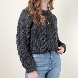 Stunning handmade vintage Aran style chunky cable-knit crew neck sweater. A gorgeous detailed knit pattern with ribbing on the hem & braiding effects made in a dark stormy grey color. This is the perfect cozy sweater for fall & winter! Looks great tucked into a pair of high-waisted jeans, worn with a simple midi skirt, or dressed up with a pair of straight leg trousers. Guaranteed to get so many compliments whenever you wear this piece!