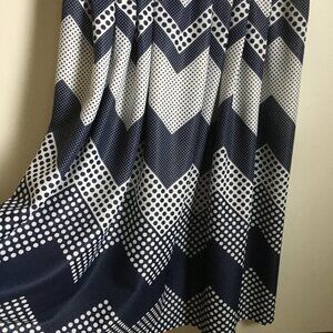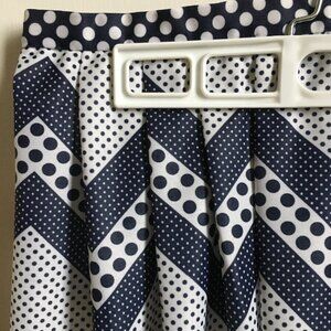 Very good preowned vintage condition, handmade navy blue and white Charlie Brown zig-zag and polka dot pattern midi skirt with a zipper and button clasp in the back. Retro 50s to 70s vibes.