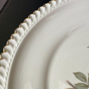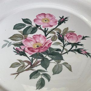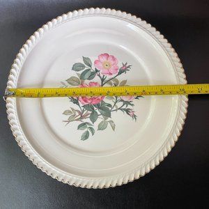 Selling a beautiful pristine Vintage Harker Pottery Co "Wild Rose" collection Plate platter with a 22 Kt Gold rim. Royal Gadroon pattern. Diameter is just over 10". Circa 1950s. This is a beautiful cake plate or serving plate dish. No cracks or fading at all. Hard to find in excellent condition.