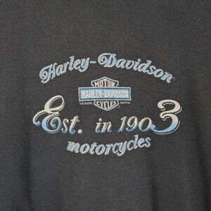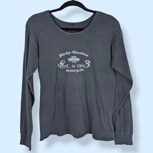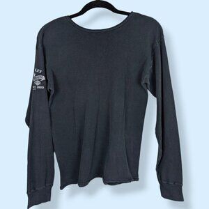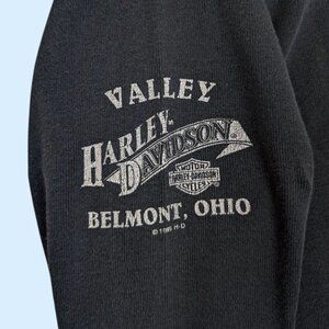 This vintage long sleeve shirt by Harley-Davidson no longer has legible tags but is most likely made of 100% cotton or a cotton/polyester blend. The shirt is a dark blue and the front has a small logo in blue and white. The left arm has a secondary logo that says, "VALLEY, BELMONT, OHIO". The shirt has little details like in the neckline (2nd last pic) that remind me of shirts I wore as a kid. The hem at the bottom is broken in several places, and it appears that someone has just straight up sewn a new hem over/just below it. The shirt has wear throughout but is still very wearable.