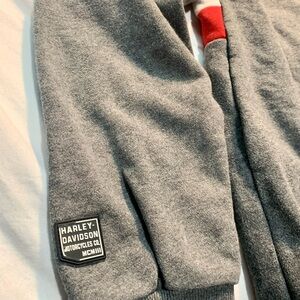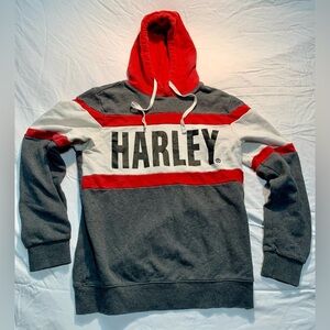 Bold and stylish, this Harley-Davidson hoodie is a must-have for fans of the brand. Features striking red, white, and gray color blocking with a large “HARLEY” logo across the front. Slim fit cut for a modern, flattering look. Comfortable fleece lining and adjustable drawstring hood.