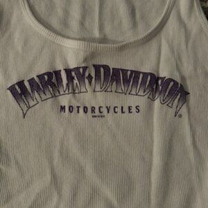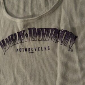 Lightweight white tank with purple Harley-Davidson arch logo. Simple and easy to style.