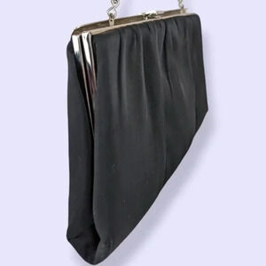 This vintage clutch by Harry Levine is beautiful. The "frame" and clasp are made of a silver tone metal, and the black exterior fabric is pleated in places, presumably to allow for things to be put inside it). There is a thin chain handle that can be used to carry to purse, or it can be completely tucked inside the purse to convert it into a clutch. The purse has a pink lining that is stamped "HL USA". There are signs of vintage wear, but this purse is in good useable condition overall.
