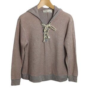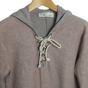This is a hooded sweatshirt with a lace up grommet front neckline by Vintage Havana. Made from reversed pink terry fabric.