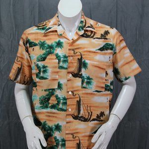 Vintage Hawaiian Shirt - Island and Tribal Pattern by Van Cort - Men's Medium