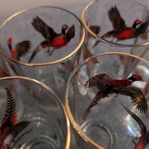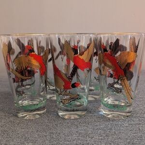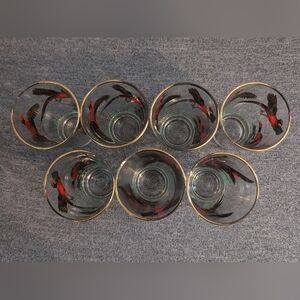 Vintage Hazel Atlas Drinking Glasses with Gold Rim, Set of 7. In very good used condition, with some wearing of the gold rim on a few of the glasses (see photos for example). No defects noted otherwise. Each measures 5" tall, 2 3/4" in diameter. tags: hunting bird special occasion dinner party classy display collectable