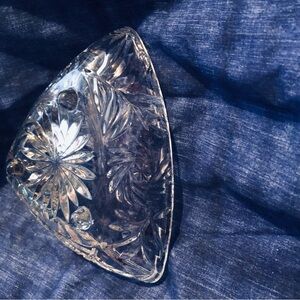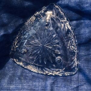 Add a touch of vintage charm to your collection with this beautiful Hazel-Atlas Triangle Capri Pinwheel Clear 3 Footed Dish/Ashtray. Crafted from high-quality glass, this decorative bowl is perfect for all occasions. Its unique triangle shape and clear color make it an eye-catching addition to any table setting.
