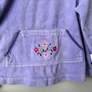 I’m very good, clean condition. Purple in colour with darker purple trim. Front pocket pouch with an embroidered flower design. Cotton blend that almost feels like a softer terry cloth type texture.