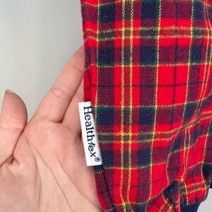 Vintage Healthtex jumpsuit. Could also be worn as a sleeper. Has a light fleecy feeling to the material. Red and navy plaid colour with some green and yellow mixed in. White eyelet lace trim and a bow completes the look! Leg snaps and front snap for easy changes. Tags still attached, which includes a really cool sizing chart! Elastic cuffs are in great condition.