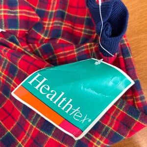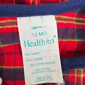 Vintage Healthtex jumpsuit. Could also be worn as a sleeper. Has a light fleecy feeling to the material. Red and navy plaid colour with some green and yellow mixed in. White eyelet lace trim and a bow completes the look! Leg snaps and front snap for easy changes. Tags still attached, which includes a really cool sizing chart! Elastic cuffs are in great condition.